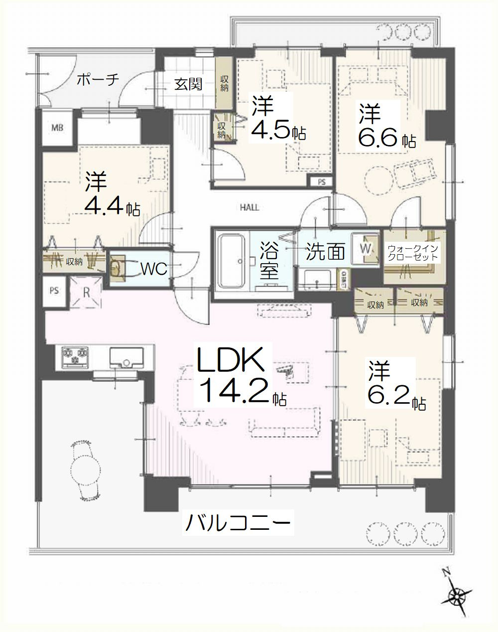 LDK 14.2帖 / 洋室 4.5帖 / 洋室 4.4帖 / 洋室 6.6帖 / 洋室 6.2帖 / |