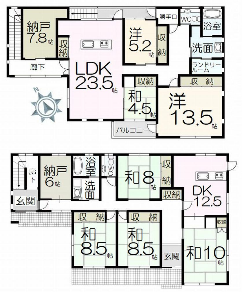 LDK 23.5帖 1室 / 和室 4.5帖 1室 / 洋室 13.5帖 1室 / 洋室 5.2帖 1室 / 和室 8.0帖 2室 / 和室 6.0帖 1室 / 和室 8.0帖 1室 / 和室 10.0帖 1室 / DK 12.5帖 1室 / S(納戸) 7.5帖 1室 / |