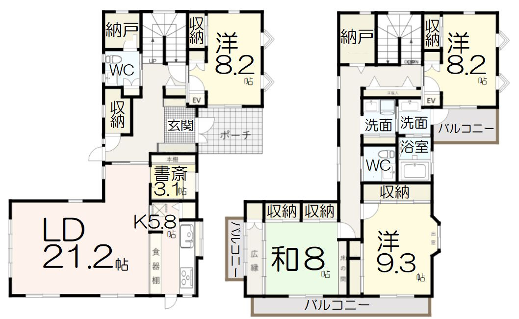 LD 21.2帖 1室 / 洋室 3.1帖 1室 / K 5.8帖 1室 / 洋室 8.2帖 1室 / 洋室 8.2帖 1室 / 洋室 9.3帖 1室 / 和室 8.0帖 1室 / S(納戸) 2.7帖 1室 / |